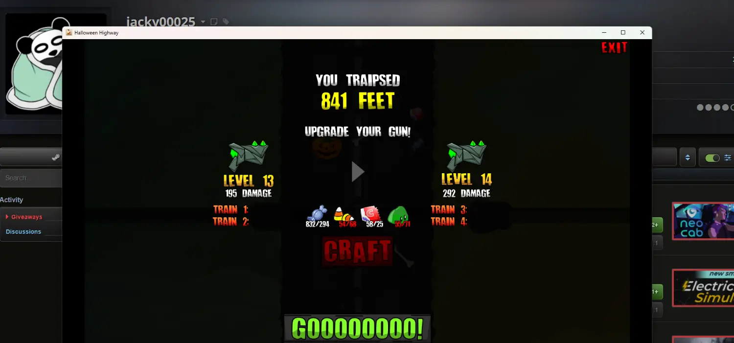 As you run along, you'll see different pickups...various types of Halloween candy as well as ghost slime. Whenever you die, the game over screen will show what gun level you currently have as well as how many of each pickup you need in order to craft the next level of gun. It also shows the increased damage that new gun will do. All of the various candy will simply appear along the highway as a drop...but to get the ghost slime, you have to shoot baddies with your gun. When they die, ghost slime will splat out through the air and land somewhere on the highway.