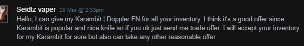 Sounds legit :D I'd totally go for it. I just briefly need his knife first to confirm it's not duped. Afterwards we can trade.